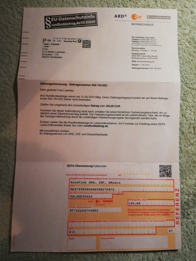 Sie haben als “öffentlich-rechtliche, nicht rechtsfähige Gemeinschaftseinrichtung” den Nachweis erbracht, dass sie Fehler in der Kontoführung begehen, die nach gesunden Rechtsempfinden betrügerisch sind. Da sie über einen Zeitraum von nunmehr 3 Jahren nicht in der Lage sind diesen Fehler zu korrigieren, gehe ich davon aus, dass sie eine kriminelle Organisation sind. An kriminelle Organisationen zahle ich keine Beiträge.