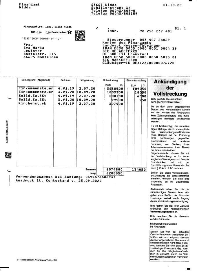 - Das Steuerbüro Achim Ziemer in Nonnweiler ist mit der Erstellung der Einkommensteuererklärung 2019 beauftragt, hat jedoch wegen Krankheit der Sachbearbeiterin noch keine abgeliefert.