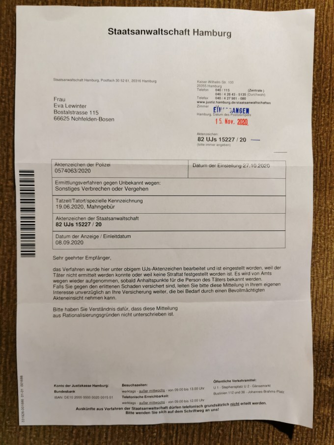 Die deutsche Polizei sendet nicht nur Briefe über Strafanzeigen an Personen, ohne sie über den Sachverhalt zu informieren sondern auch die Staatsanwaltschaft sendet Briefe ohne Bezug zur Online Strafanzeige!