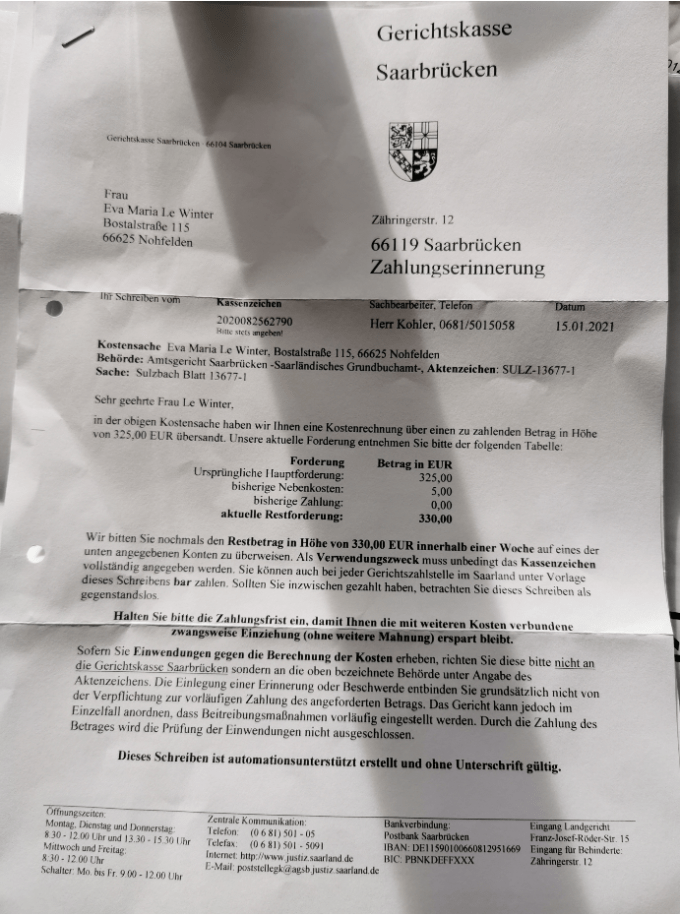 Dafür darf aber dann die Gerichtkasse ohne weitere Mahnung eine zwangsweise Einziehung durchführen.