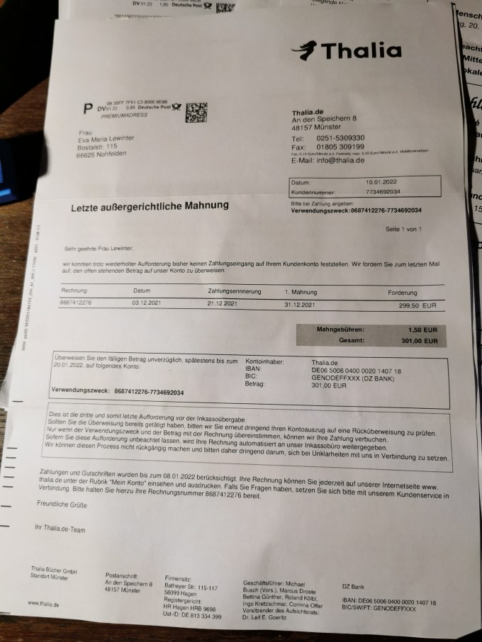 ich habe ihren Brief vom 10.01.2022 erhalten und sie schreiben “Letzte außergerichtliche Mahnung”.